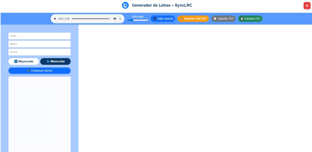 Al abrir SyncLRC verás la aplicación en blanco, con todos los campos preparados para comenzar: reproductor de audio, botón para subir audio, importar LRC/TXT, exportar TXT y exportar LRC. También encontrarás los campos de título, álbum, artista y un área para pegar o escribir la letra.