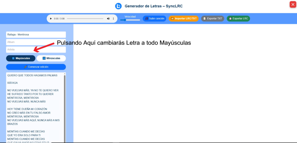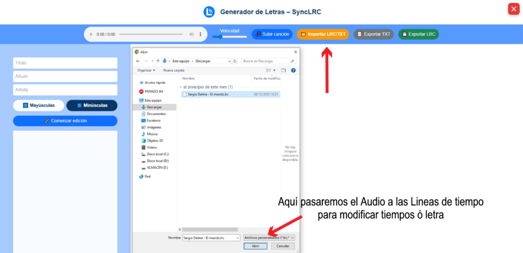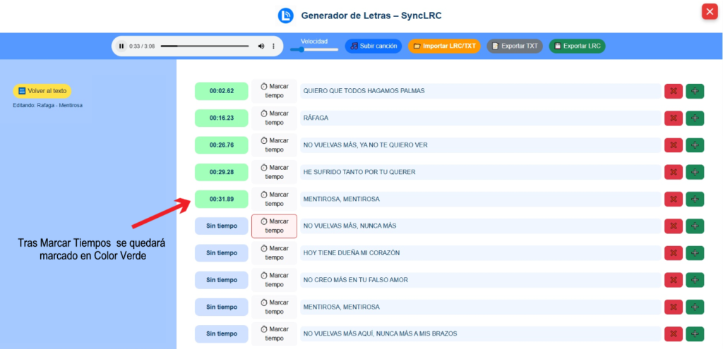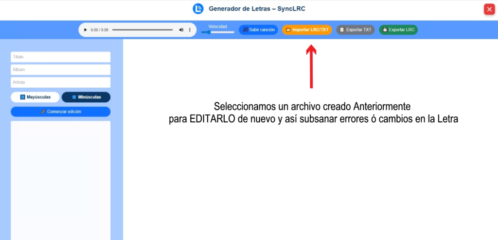Puedes importar archivos TXT o LRC ya existentes. El contenido se cargará directamente en las líneas de tiempo.