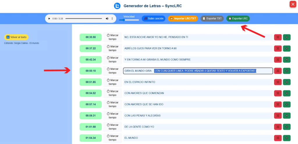 Desde ahí podrás editar el texto, corregir líneas, volver al modo texto o sincronizar rápidamente subiendo un audio.