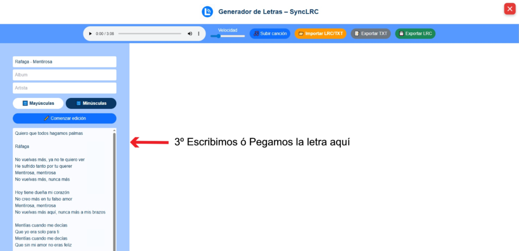 Una vez subido el audio, pega o escribe la letra en el campo correspondiente. Puedes dejar el texto tal cual, editarlo, añadir anotaciones o modificarlo libremente.