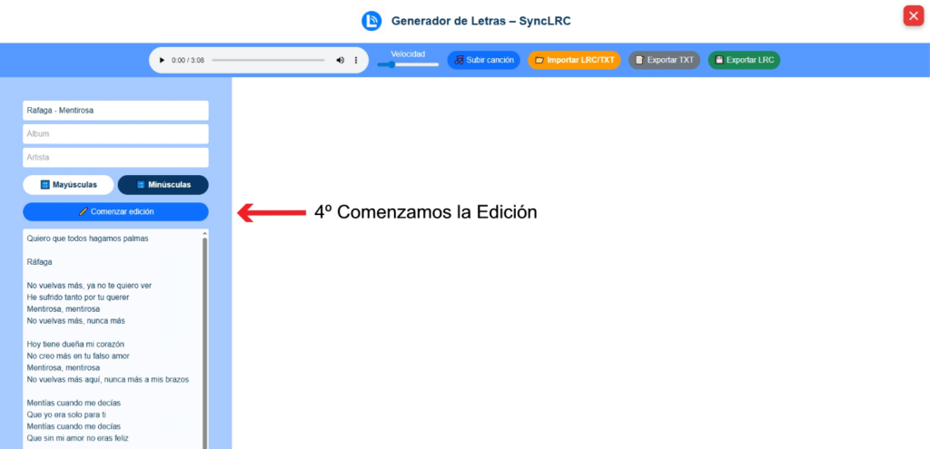 Cuando tengas el texto listo, pulsa el botón Comenzar edición. La letra se trasladará al centro de la pantalla y se dividirá en líneas, cada una con su espacio para asignar tiempos.