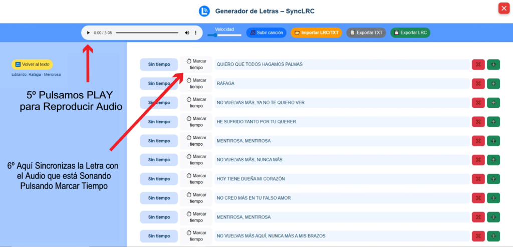 Pulsa Play en el reproductor y, mientras suena el audio, presiona Marcar tiempo en cada línea cuando corresponda.