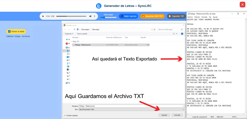 Exportar TXT: genera un archivo de texto sin sincronización, respetando mayúsculas o minúsculas.